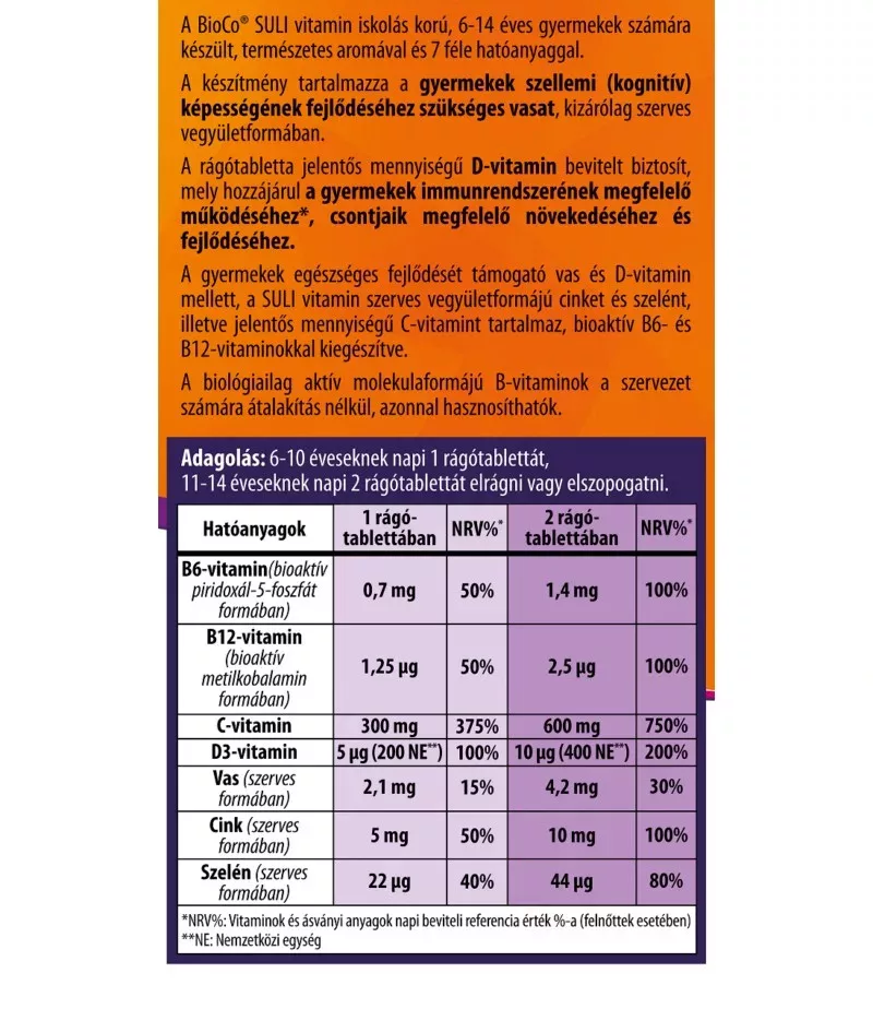 A BioCo® SULI vitamin iskolás korú, 6-14 éves gyermekek számára készült, természetes aromával és 7 féle hatóanyaggal.