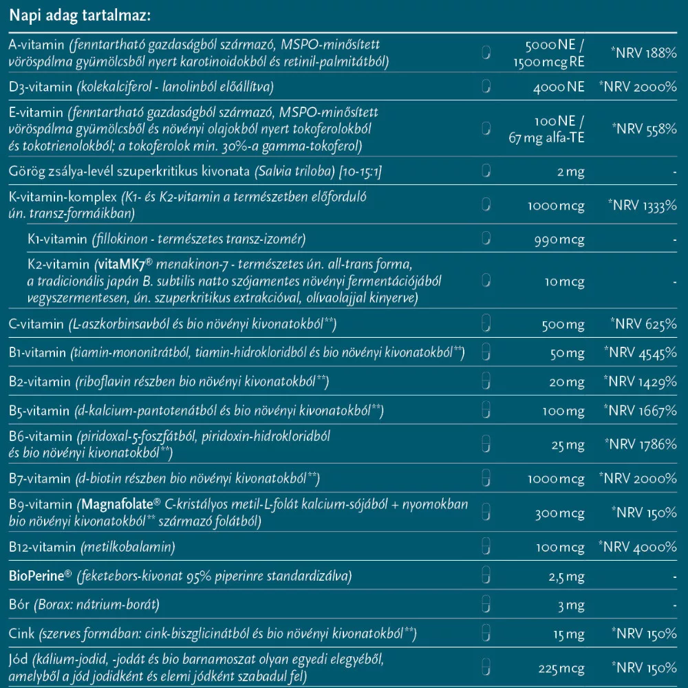 Bár minden felhasznált hatóanyagforma eleve kiváló felszívódással rendelkezik, azt Bioperine® feketebors-kivonattal is fokoztuk. Továbbá arra is ügyeltünk, hogy a vízoldékony és zsíroldékony összetevőket ne keverjük, hogy a számukra ideális hasznosulást és stabilitást biztosító módon lehessenek jelen, külön-külön: