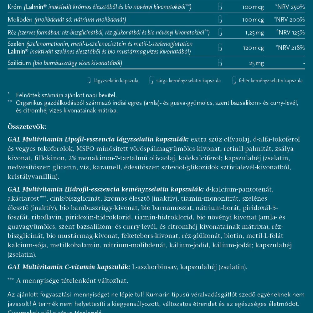 A GAL Multivitamin termékünket a legújabb kutatások fényében fejlesztettük ki, szem előtt tartva a természetességet és életszerűséget, hogy minden vitamint, ásványianyagot, nyomelemet ideális formában, mennyiségben és arányban tartalmazzon, nem eltérve attól, ahogyan ezekhez állandó tápanyagdús, változatos táplálkozással juthatnánk. Ahol előnyös, a vitaminok és ásványok részben organikus termesztésből származó (bio) gyógy- és fűszernövények kivonatából származnak. A mennyiségek esetében végig fontosnak tartottuk, hogy a napi adag biztosan tartalmazza a hatásosnak talált dózist, de semmi esetre se lépje túl az életszerű mennyiségeket, azaz azt a mennyiséget, amit táplálkozással már nem is lehetne fedezni sehogyan sem. Emellett rendkívül fontos, hogy a gondosan válogatott alapanyagok mellett ne lábatlankodjék semmi, ami nem odavaló. A termékünkben ilyesminek nyomát sem találja.