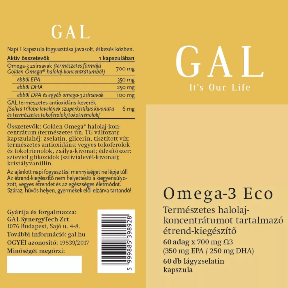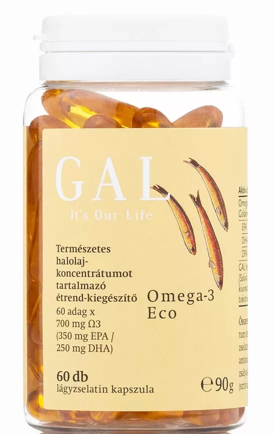 A GAL Omega-3 Eco lágyzselatin-kapszulánként 700 mg Ω3-zsírsavat tartalmaz, amiből 350 mg EPA, 250 mg DHA, 100 mg pedig DPA és SDA. (Más halolaj-kapszulák jellemzően 100-350 mg közötti Ω3-at tartalmaznak.)