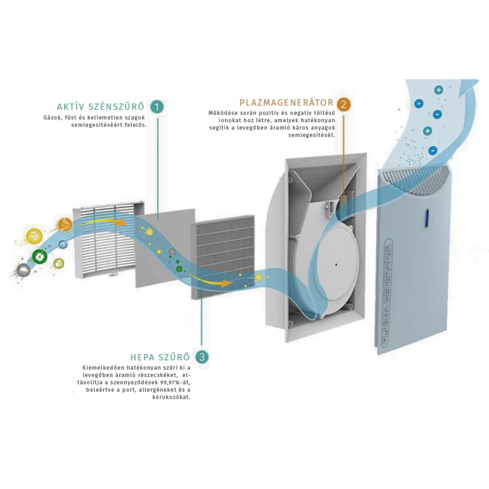 - HEPA szűrő: por, allergének, kórokozók kiszűrése. A levegőben áramló szennyező részecskéket 99,97%-os hatékonysággal szűri ki.