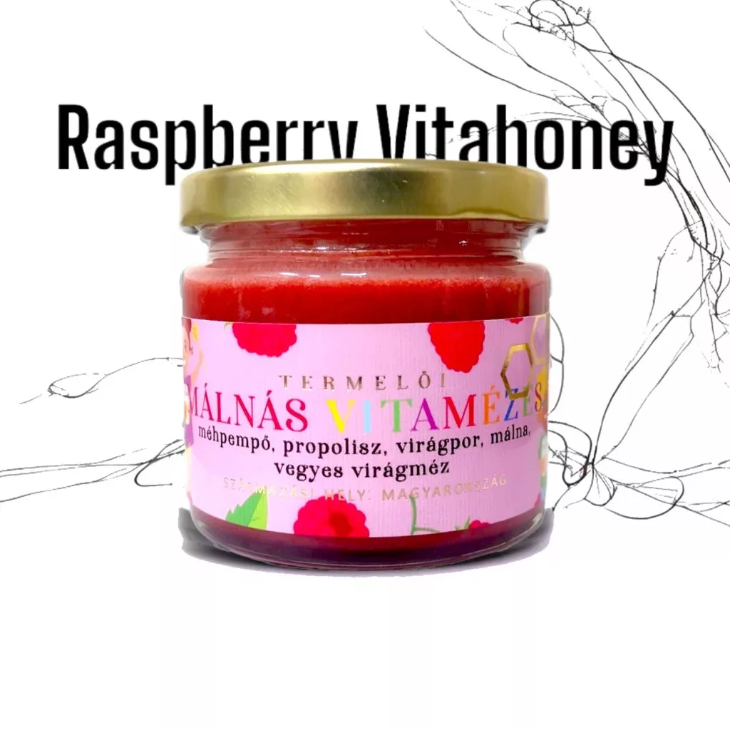 Termelői málnás vitamézes. Összetevők: vegyes virágméz, 100%-os liofilizált (fagyasztva szárított) málna, virágpor, propolisz, méhpempő.