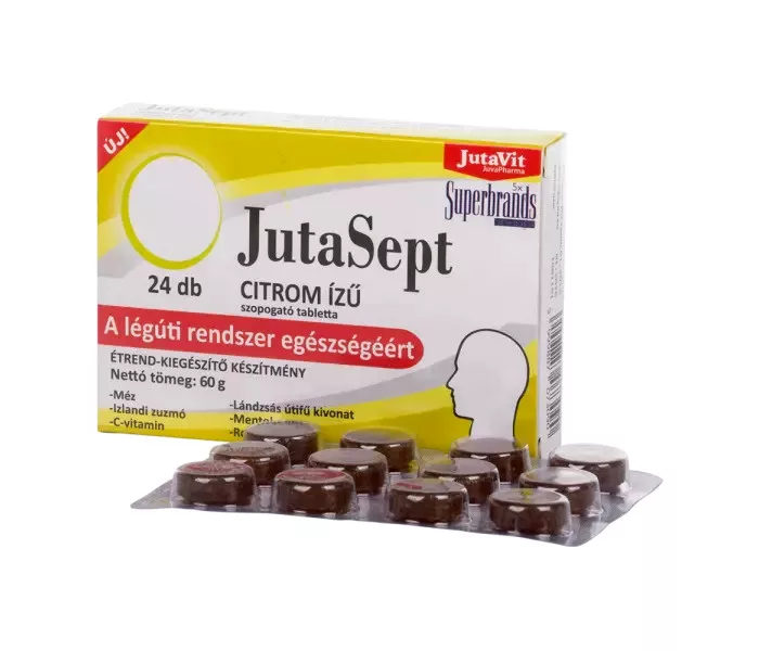 A JutaSept citrom ízű, mézet, izlandi zuzmót, C-vitamint, lándzsás útifű kivonatot, mentolt és rozmaring olajat tartalmazó étrend-kiegészítő szopogató tabletta édesítőszerekkel, 24 db-os kiszerelésben a légúti rendszer egészségéért.